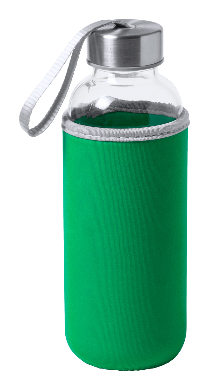 Szklana butelka z paskiem do noszenia na zakrętce i kolorowym neoprenowym pokrowcem. 420ml. Nie nadaje się do napojów gazowanych.