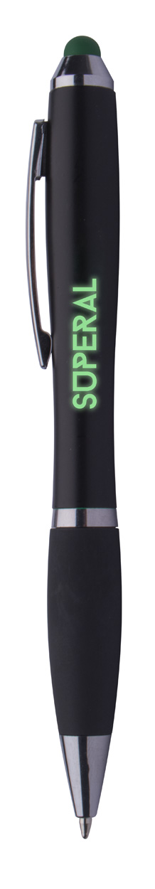 Plastikowy długopis z końcówką do ekranów dotykowych. Korpus w kolorze czarnym z gumowym uchwytem i dopasowanym kolorystycznie podświetlanym grawerem. Podświetlenie włączamy przełącznikiem na korpusie. Z baterią guzikową w zestawie. Z niebieskim wkładem.