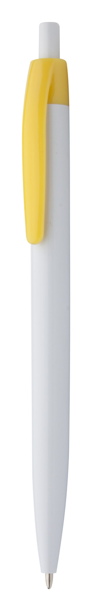 Plastikowy długopis z białym korpusem i kolorowym klipsem, w zestawie z niebieskim wkładem.