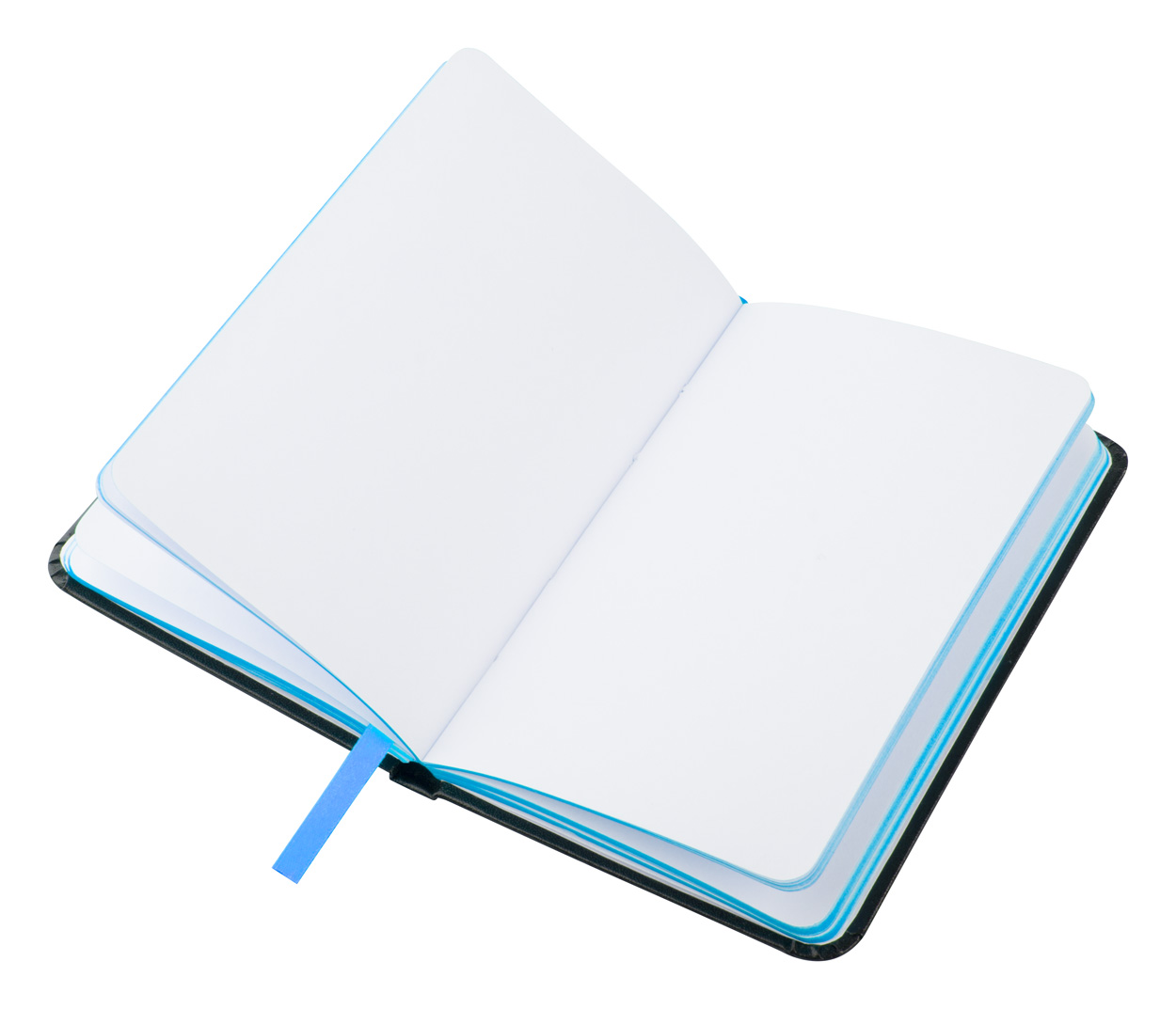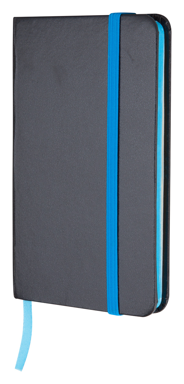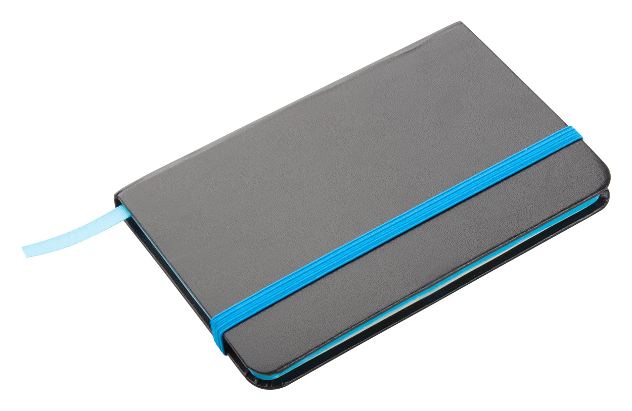 Notes B7 z 80 gładkimi kartkami, papierową okładką, kolorową gumką i tasiemką w tym samym kolorze.