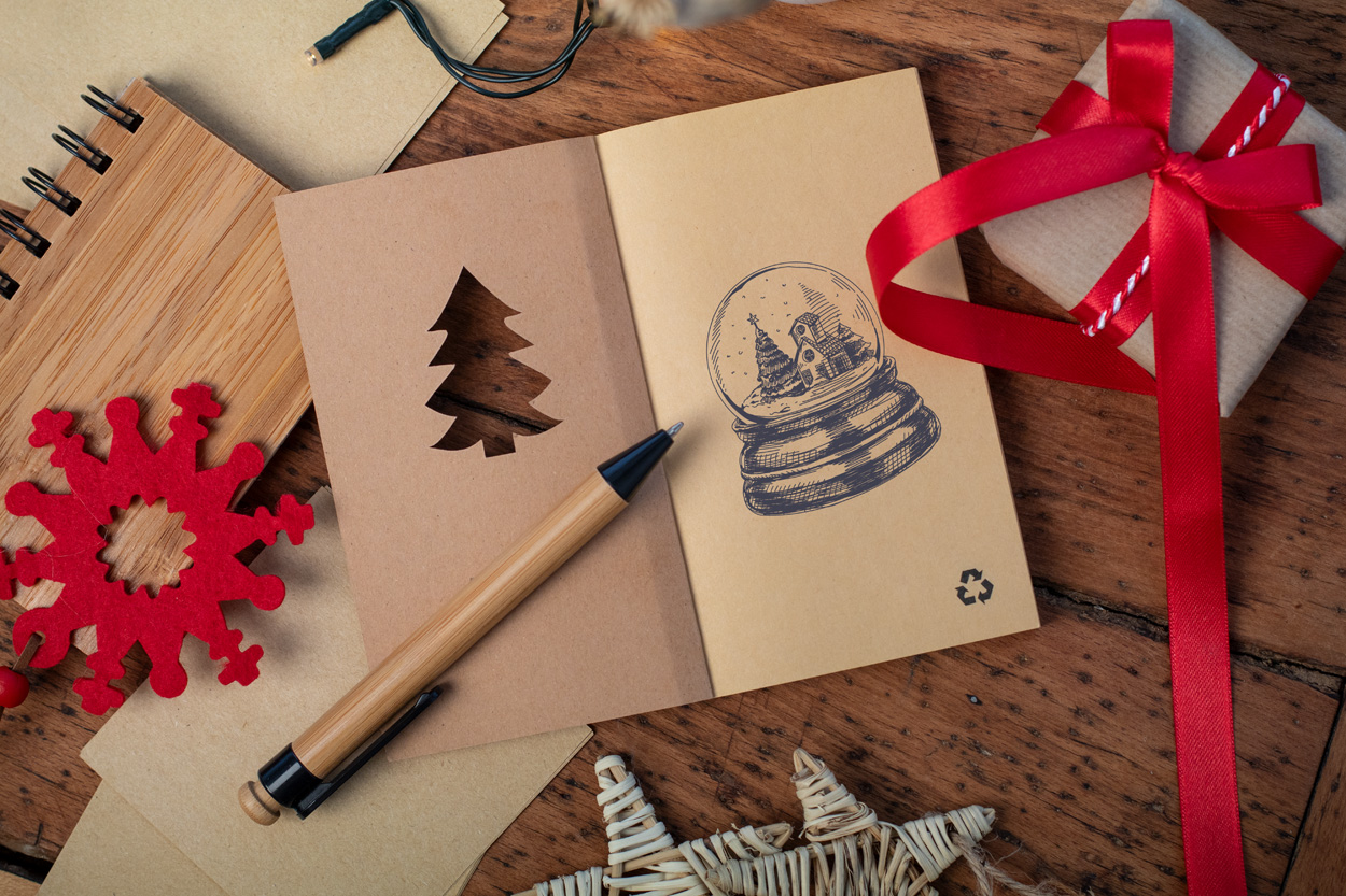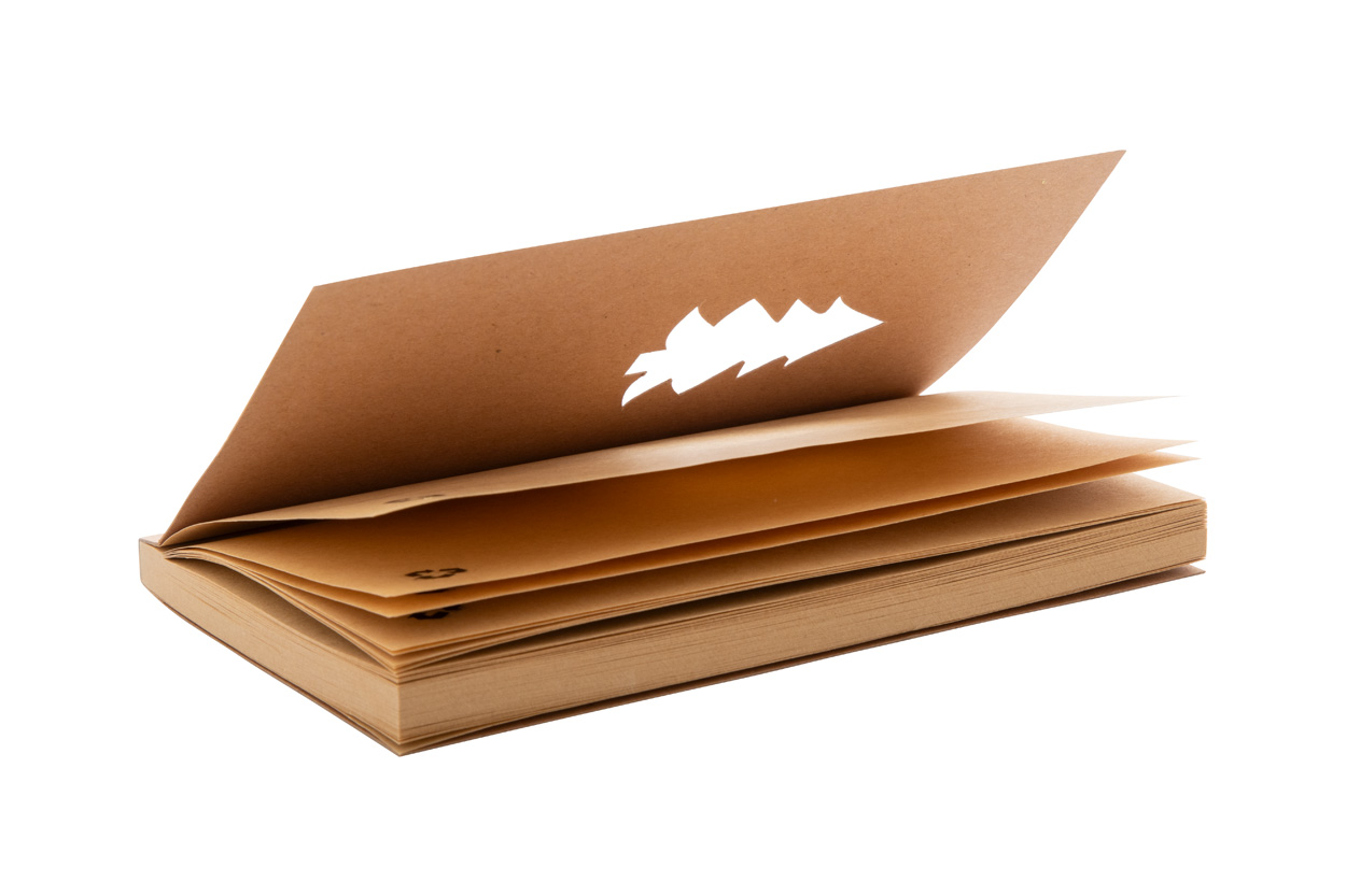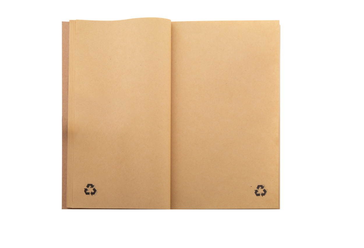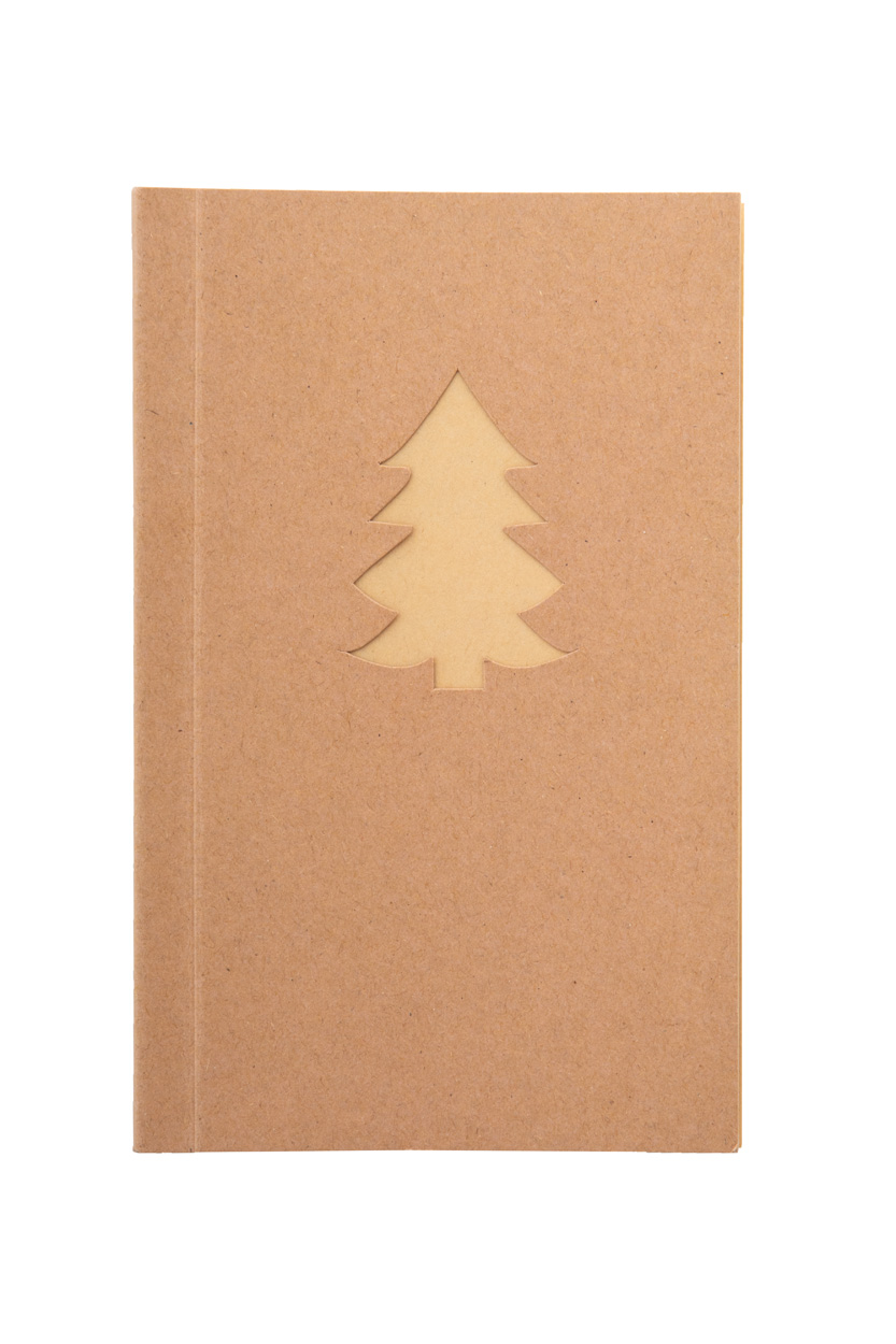 Notes z papieru kraft z wykrojoną choinką na okładce i 85 czystymi kartkami z papieru kraft z recyklingu.