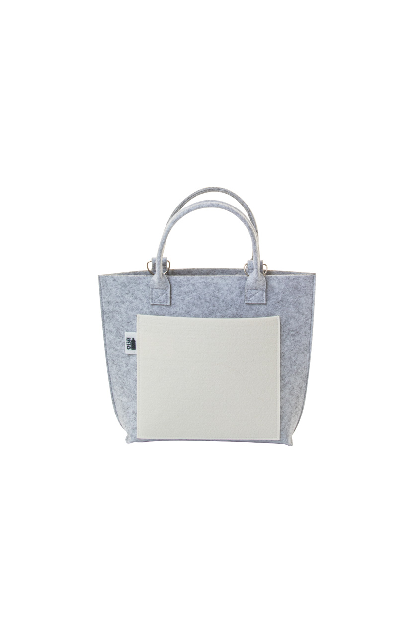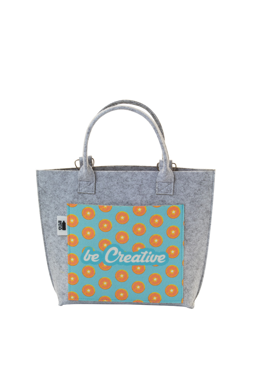 Personalizowana, filcowa torba damska RPET z przednią kieszenią z nadrukiem w full kolorze. Z krótkimi uchwytami, odpinanym paskiem na ramię i charakterystyczną metką RPET. Cena zawiera nadruk sublimacyjny. Min. ilość: 50 szt.