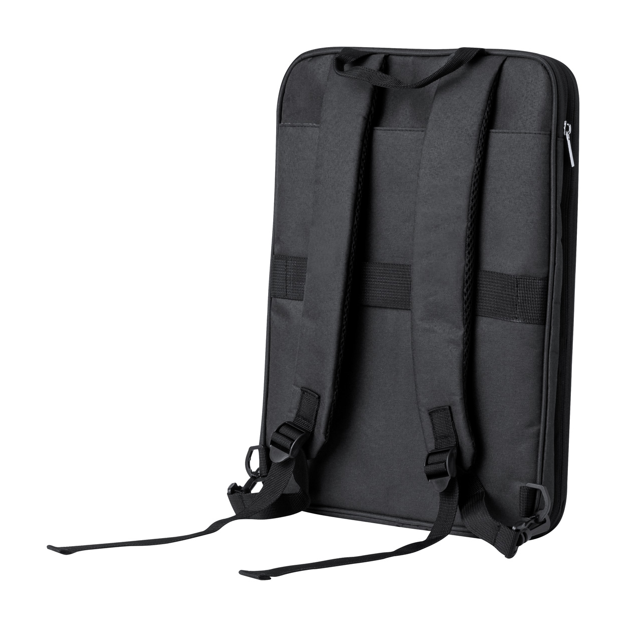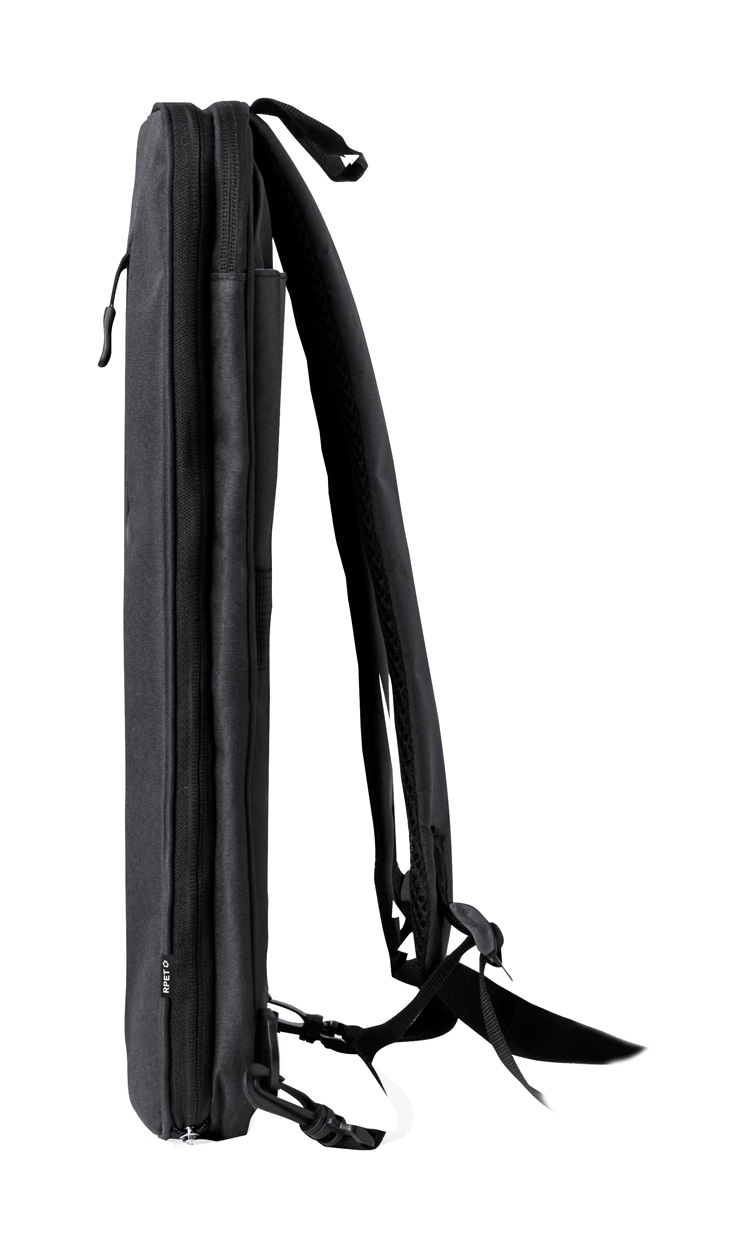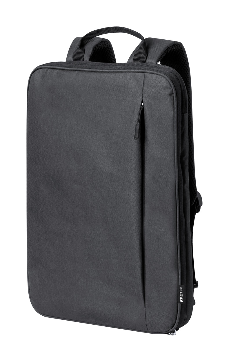 Rozsuwany plecak RPET z przegrodami zapinanymi na zamek, wyściełaną przegrodą na laptopa (15") i tablet (10"), wyściełanymi plecami i paskami naramiennymi. Poliester 300D RPET z charakterystyczną metką RPET.