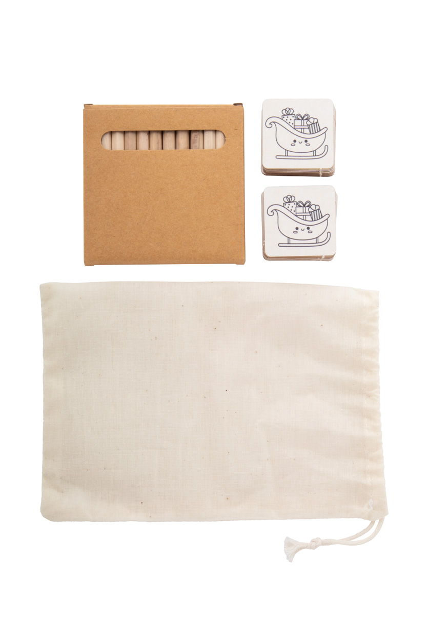 Świąteczna gra memory do kolorowania w bawełnianym etui. Zawiera kartonową grę pamięciową (24 płytki) z motywami bożonarodzeniowymi i drewniane kredki (12 sztuk) w papierowym pudełku.