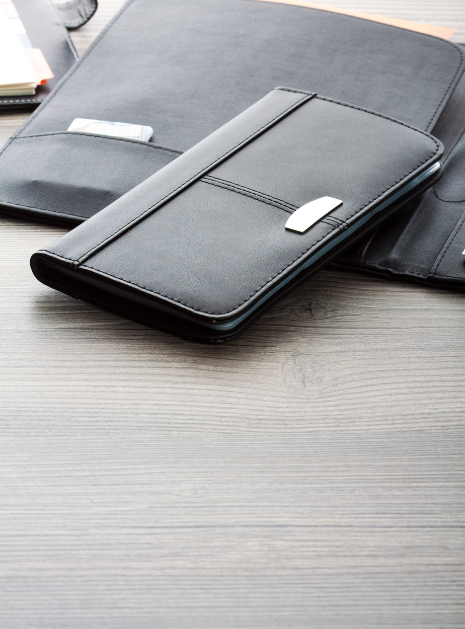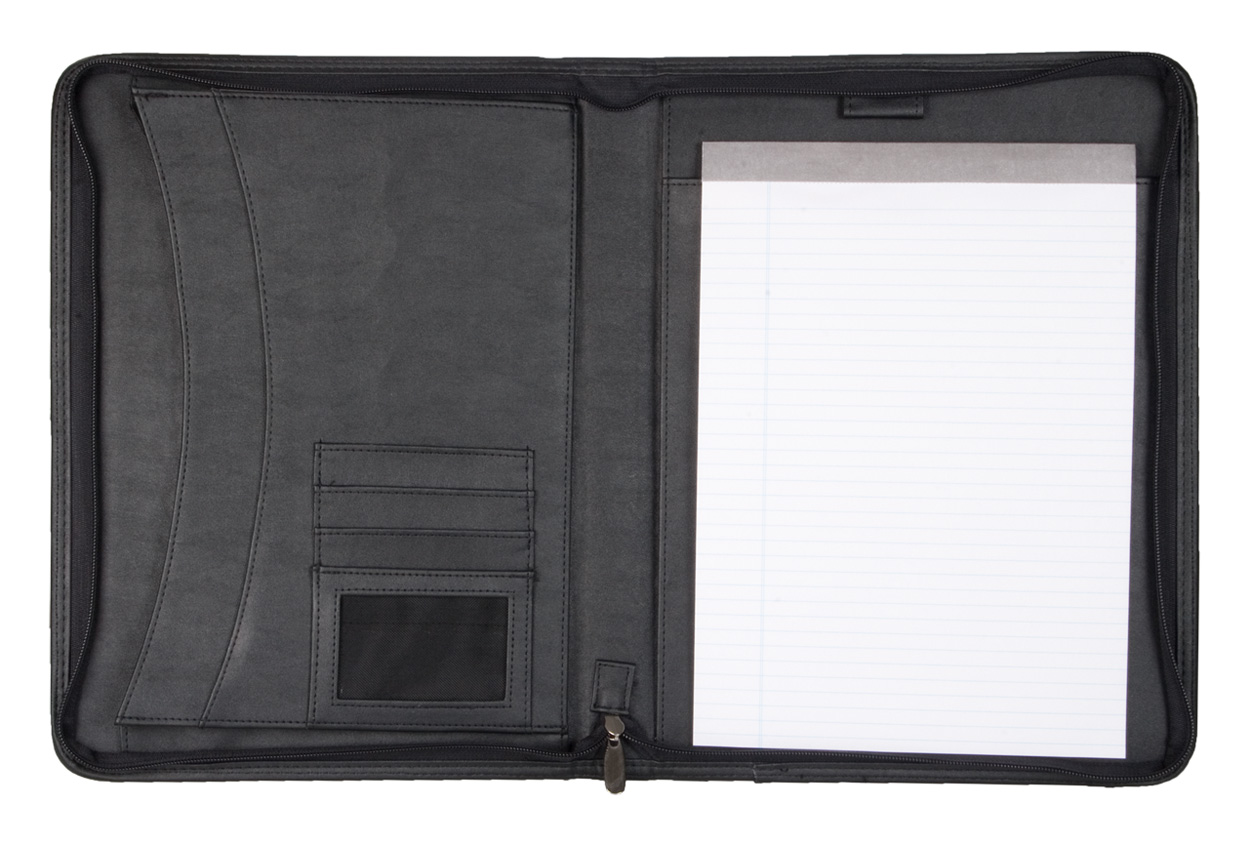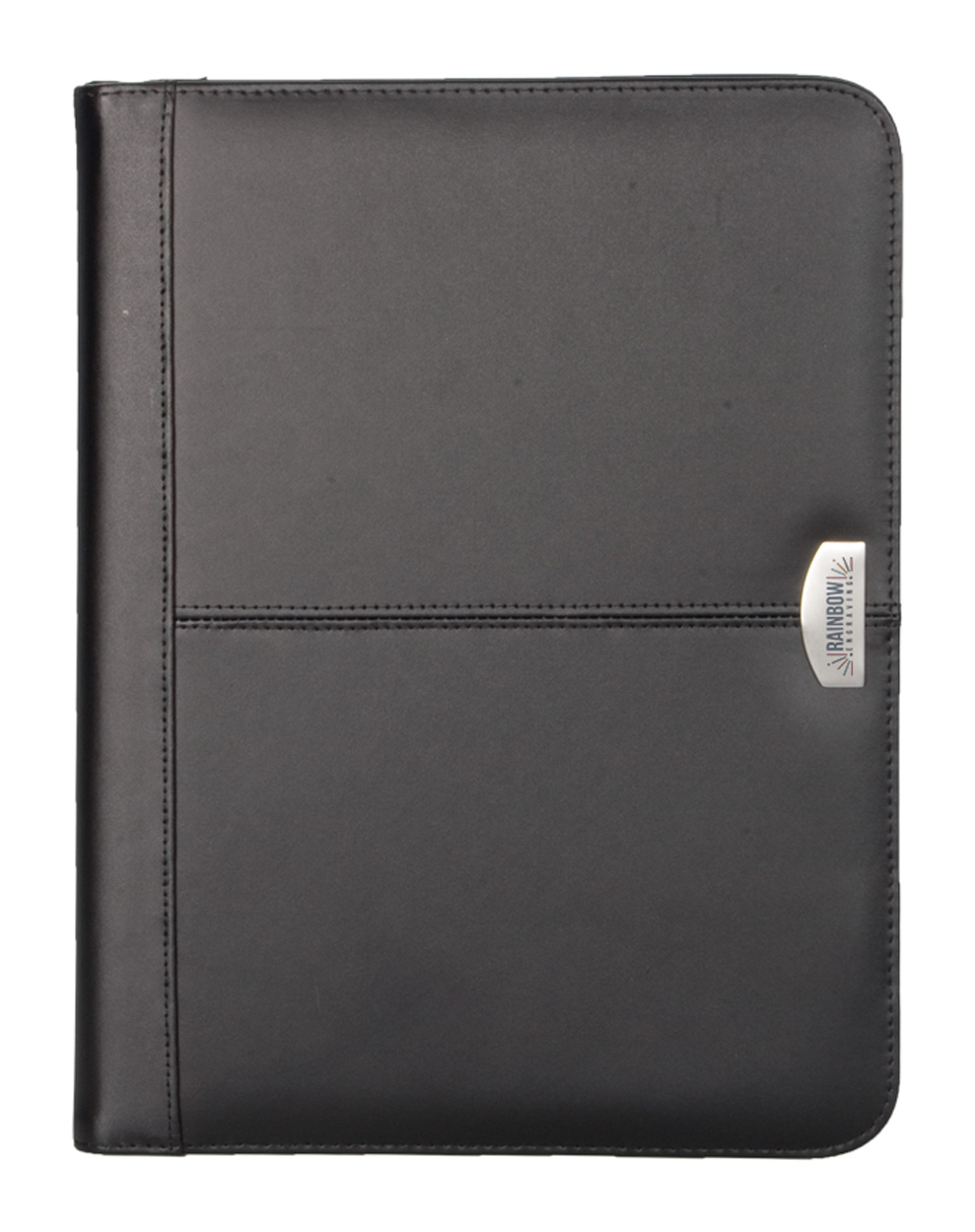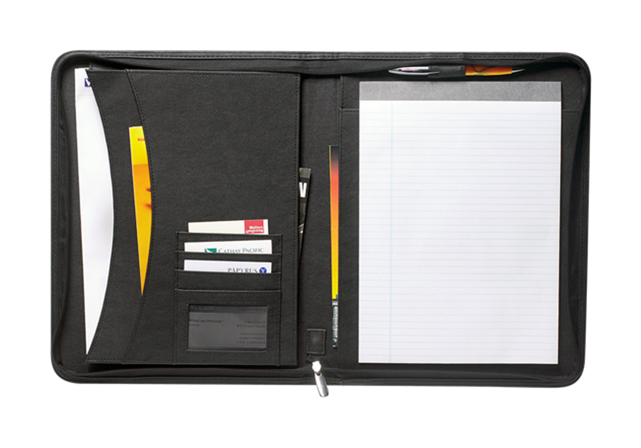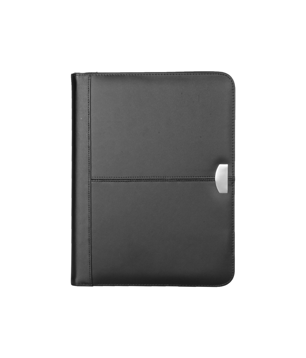 Zapinana teczka na dokumenty A4 ze skóry, z notatnikiem w linie oraz miejscem na długopis i wizytówki. Na okładce posiada metalową płytkę.