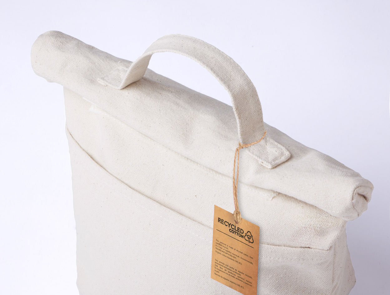 Zwijana torba termoizolacyjna z bawełny pochodzącej z recyklingu, zapinana na rzep. Z przednią kieszenią i wyściółką PEVA.